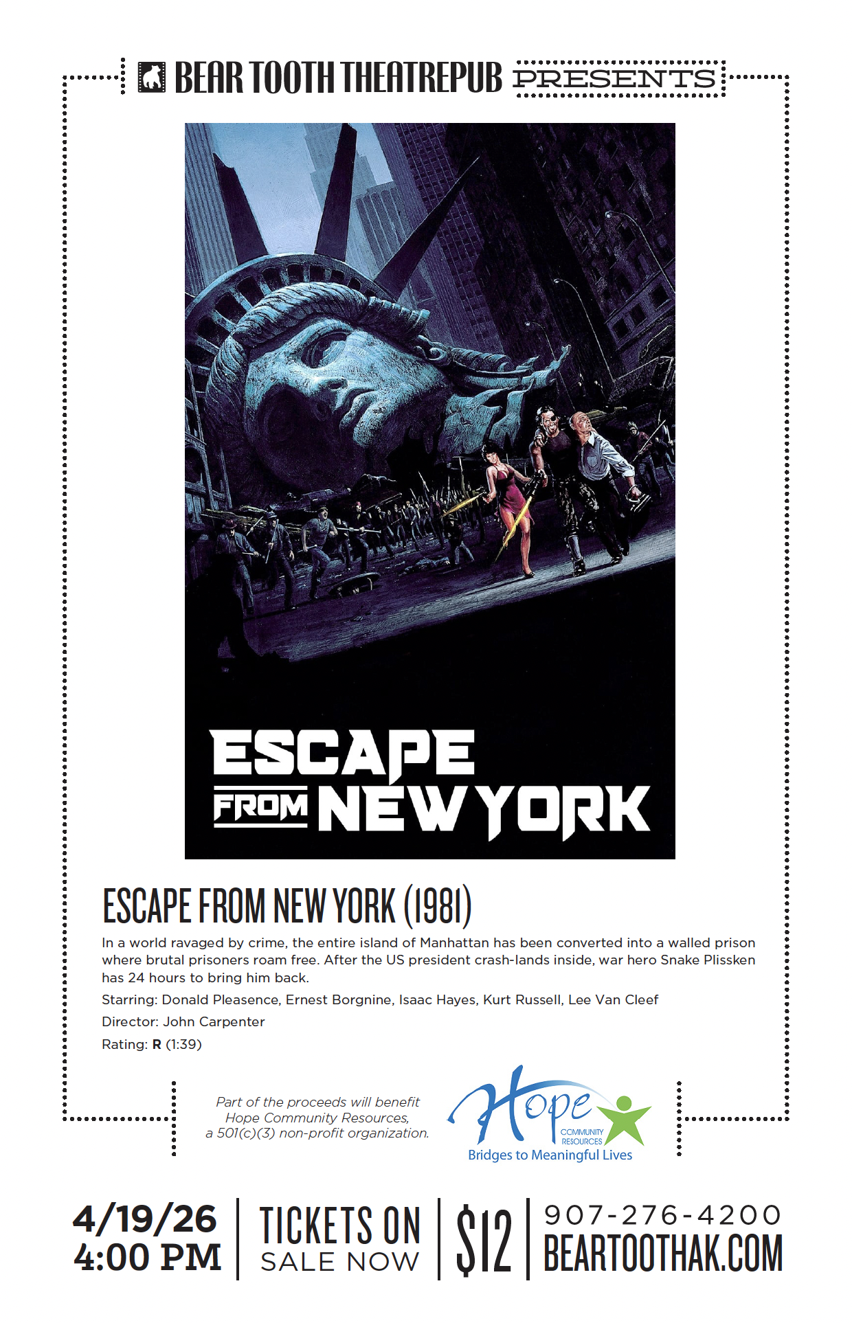 Join us for an evening at Bear Tooth Theatrepub, where Hope will present the 1981 film, "Escape from New York." In a world ravaged by crime, the entire island of Manhattan has been converted into a walled prison where brutal prisoners roam free. After the US president crash-lands inside, war hero Snake Plissken has 24 hours to bring him back.