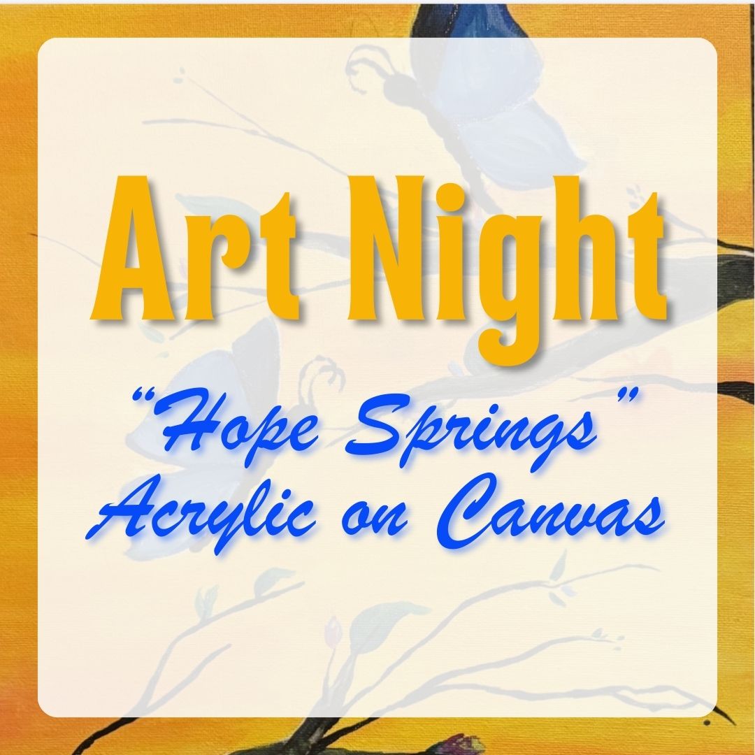Join us for a FREE Art Night where you’ll paint your own “Hope Springs” butterfly scene using acrylic on canvas. In this workshop, you’ll learn blending and shading techniques and create a piece that’s uniquely yours. Choose your own color palette for the sky and butterflies, feel free to use tracing templates for a little extra guidance, and watch your vision come to life.