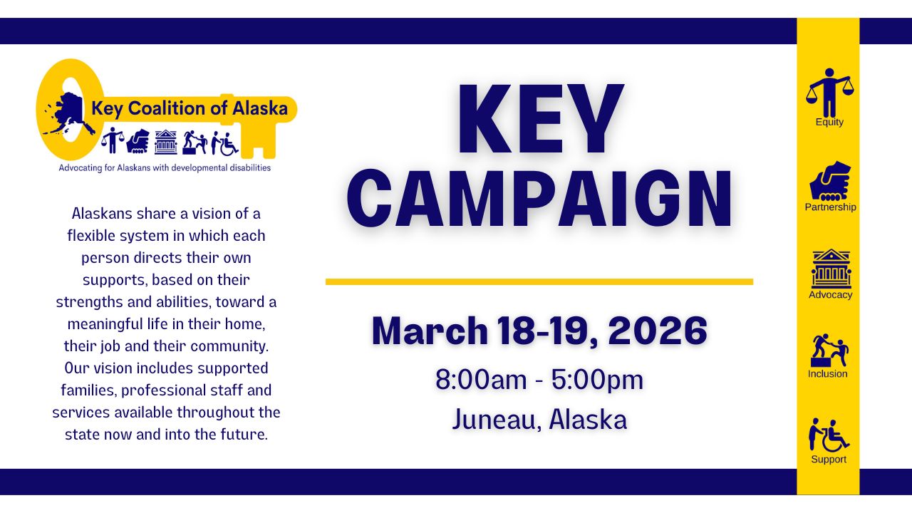 The Key Campaign is Alaska’s annual disability advocacy campaign, led by the Key Coalition of Alaska. Each year, the campaign brings together Alaskans with disabilities, family members, providers, staff, and advocates to strengthen disability rights and advance policies that expand opportunity, access, and independence across the state.